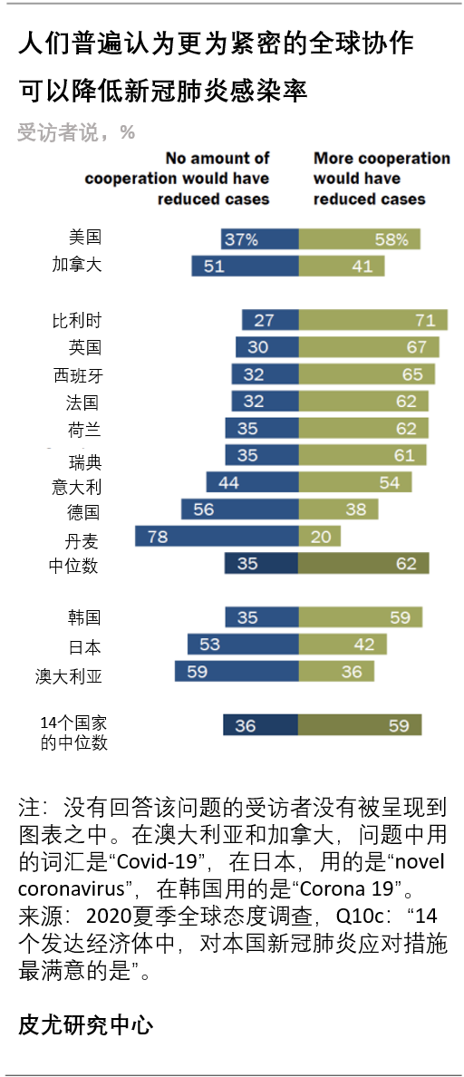人们普遍认为更为紧密的全球协作可以降低新冠肺炎感染率(图片来源:皮尤研究中心)