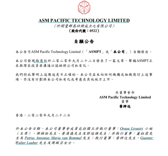 ASM太平洋在港交所公告,本公司发现外媒发表一篇文章,声称ASMPT正在与潜在投资者沟通以协助将公司私有化。特此声明上述陈述是不正确的。本公司并未向任何机构或组织商讨上述事项,亦没有计划将本公司私有化或考虑在其他地方上市。