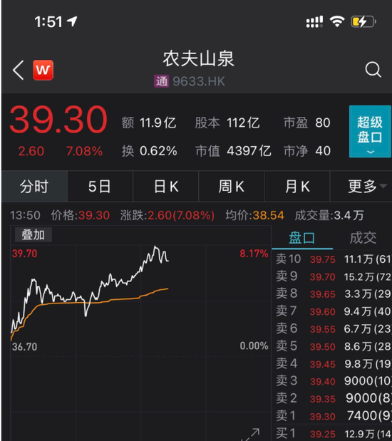 9月23日,农夫山泉延续涨势,现涨逾7%,报39.30港元。