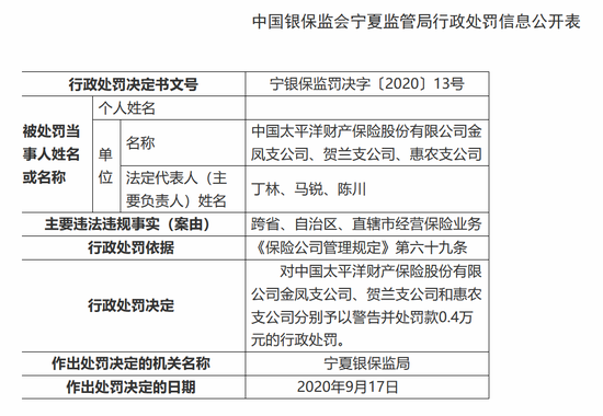 此外,中国太平洋财产保险股份有限公司金凤支公司、贺兰支公司、惠农支公司因跨省、自治区、直辖市经营保险业务,分别受到警告处分并被罚款0.4万元。