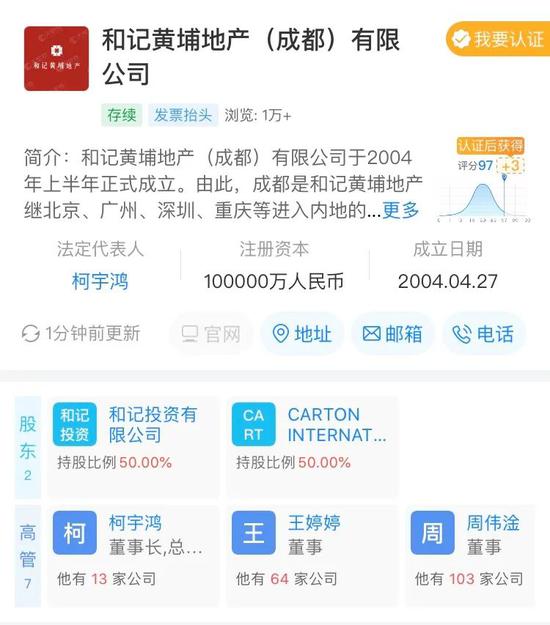 天眼查APP显示,和记黄埔地产(成都)有限公司成立于2004年,是和记黄埔地产继北京、广州、深圳、重庆之后进入内地的十四个城市之一。而和记黄埔又是香港富豪李嘉诚长江实业旗下重要上市公司,地产为其重要布局领域。
