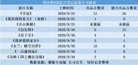 《夺冠》抢跑定档至9月25日,同一天上映的还有《菊次郎的夏天》等5部影片;《姜子牙》《我和我的家乡》等5部影片仍在9月30日、10月1日上映;《木兰:横空出世》《一点就到家》则选择避开国庆假期前三天。