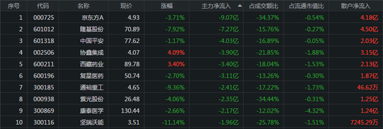 京东方A、隆基股份、中国平安分别遭主力资金卖出9.07亿元、7.27亿元、4.03亿元。