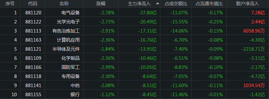 主力资金流出的板块分别是电气设备、光电、有色冶炼,主力资金流出金额分别为37.8亿元、20.49亿元、17.31亿元,其中散户净流入金额为7.48亿元、2.44亿元、6058.96万元。