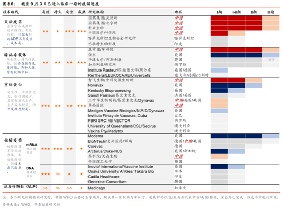 截至2020年9月3日,全球新冠疫苗研发工作共包括321种候选疫苗,其中33种候选疫苗处于临床试验阶段。进展最快的疫苗已经进入临床III期临床试验阶段,包括9种,其中4种来自中国,2种来自美国,还有英国、俄罗斯、德国各一种。