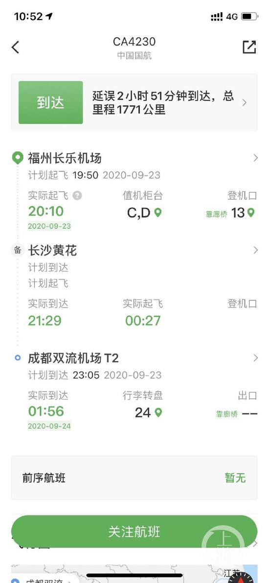上游新闻记者查询中国国际航空官方数据显示,9月23日的国航CA4230航班晚间8点10分从福州长乐国际机场起飞,晚间9点29分备降长沙黄花机场,9月24日凌晨0点27分再次从长沙机场起飞,并于凌晨1点57分在原定目的地成都双流机场落地。民航信息系统的数据显示,CA4230航班20点36分开始平飞之后,21点14分开始从7025米的巡航高度下降,并于21点29分计划外备降长沙机场。