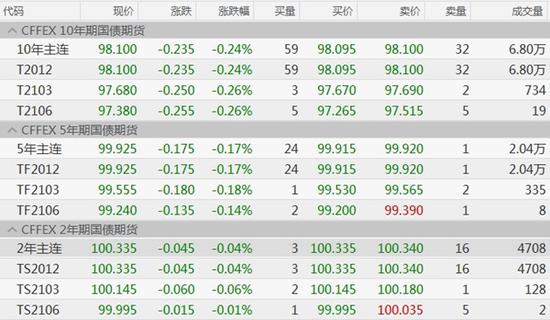 国债期货全线收跌,10年期主力合约跌0.24%,5年期主力合约跌0.17%,2年期主力合约跌0.04%。全周来看,10年期主力合约周涨0.28%,5年期主力合约涨0.01%,2年期主力合约跌0.03%。