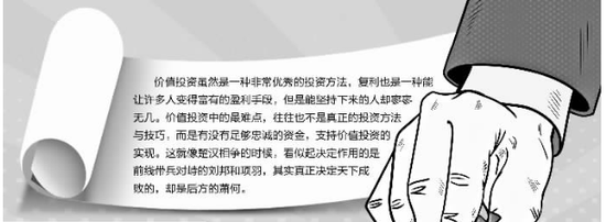 价值投资虽然是一种非常优秀的投资方法,复利也是一种能让许多人变得富有的盈利手段,但是能坚持下来的人却寥寥无几。价值投资中的最难点,往往也不是真正的投资方法与技巧,而是有没有足够忠诚的资金,支持价值投资的实现。这就像楚汉相争的时候,看似起决定作用的是前线带兵对峙的刘邦和项羽,其实真正决定天下成败的,却是后方的萧何。