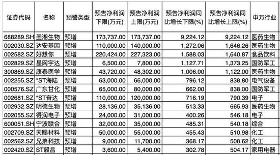 具体来看,圣湘生物、好想你、达安基因、星网宇达、康泰医学等5家公司的三季报净利润预计增幅超过10倍。值得关注的是,5家增幅居前的公司中,三家属于医药生物行业,其中圣湘生物以近百倍的增幅领跑两市。