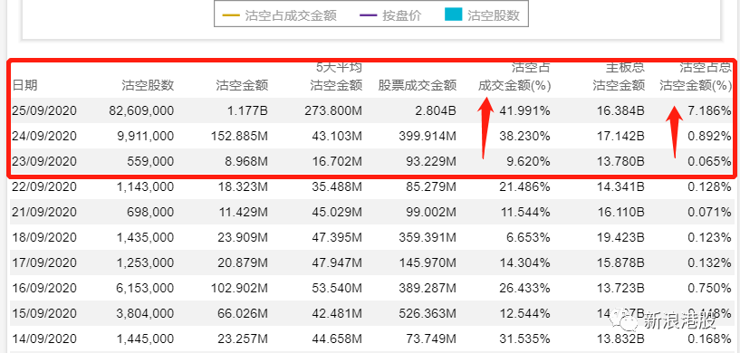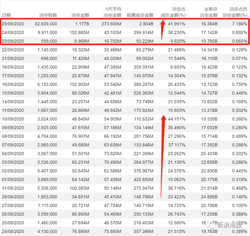新浪港股查询发现,中国恒大9月23日沽空股数只有50多万股,9月24日飙升至1000万股,9月25日进一步飙升至8000多万股。沽空比率来看,9月23日比率只有9.6%,9月24日和9月25日,中国恒大的沽空比率直接升至40%。