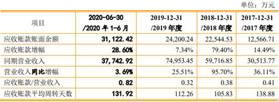 2016年末至2020年6月末,公司应收账款账面价值分别为1.02亿元、1.17亿元、2.08亿元、2.22亿元和2.86亿元,占同期期末流动资产的比重分别为46.79%、36.97%、41.43%、35.90%和42.52%。应收账款账面余额分别为1.10亿元、1.26亿元、2.25亿元、2.42亿元、3.11亿元,占营业收入的比重分别为48.96%、41.18%、37.75%、32.29%、82.46%。