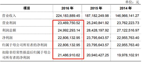 而2017年3月30日报送的招股书显示,2016年,震裕科技的营业利润为2346.98万元,利润总额为2499.23万元,归属于母公司所有者的净利润为2280.61万元,扣除非经常性损益后归属于母公司股东的净利润为2148.69万元。