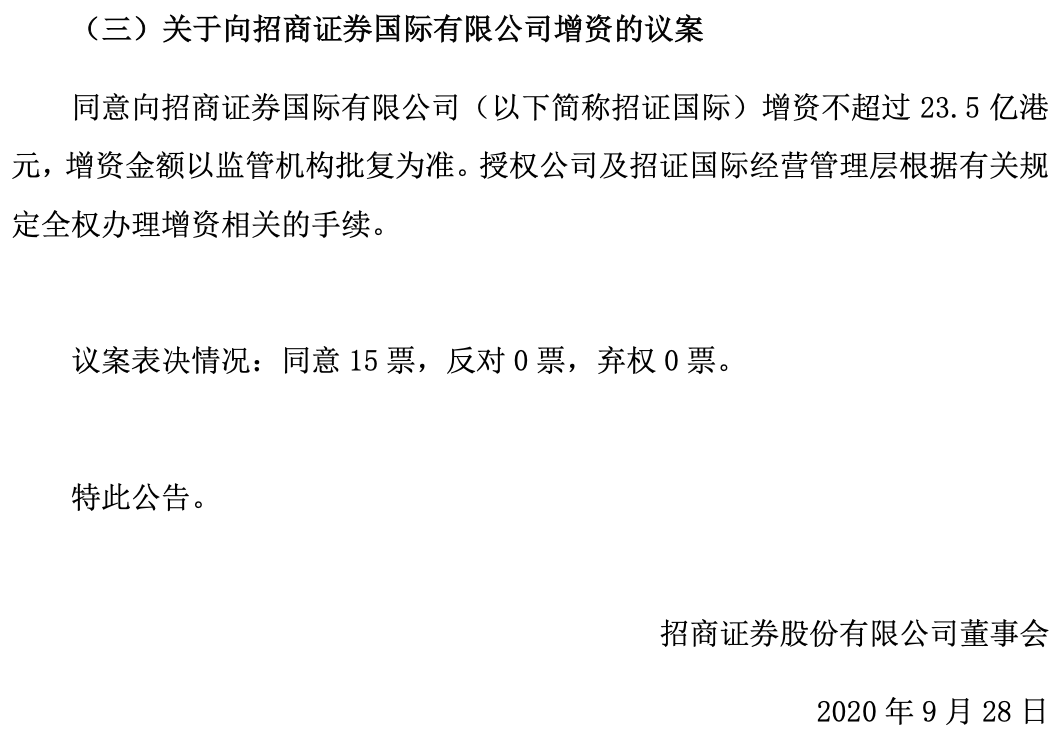 9月28日晚间,招商证券公告称,董事会通过决议同意向招商证券国际有限公司增资不超过23.5亿港元,增资金额以监管机构批复为准,并授权公司及招证国际经营管理层根据有关规定全权办理增资相关的手续。