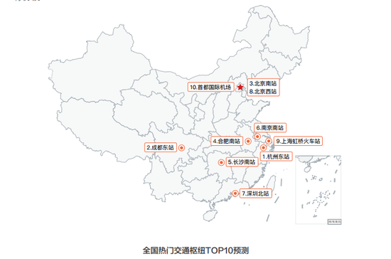 杭州东站、成都东站、北京南站、合肥南站、长沙南站、南京南站、深圳北站、北京西站、上海虹桥火车站、首都国际机场将成为前十热门交通枢纽。