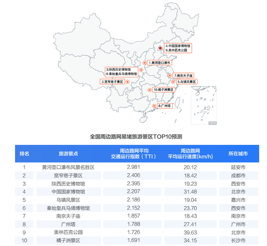 此外,黄河壶口瀑布风景名胜区、成都宽窄巷子、陕西历史博物馆、中国国家博物馆、嘉兴乌镇风景区、秦始皇兵马俑博物馆、南京夫子庙、广州塔、橘子洲等景点周围道路将更容易出现拥堵。