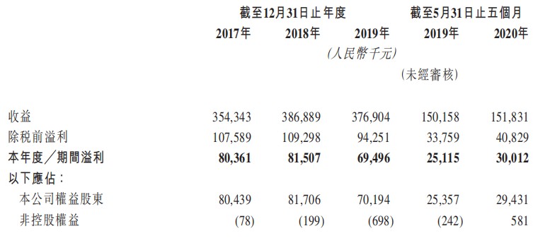 截至2017年、2018年及2019年12月31日止年度及截至2019年及2020年5月31日止五个月,溢利分别约为8036.1万元、8150.7万元、6949.6万元、2511.5万元及3001.2万元。