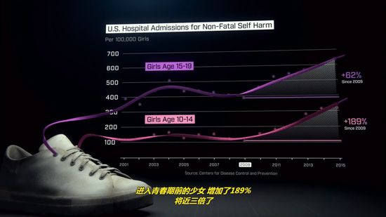 纪录片截图:近20年,美国每年少女因手机上瘾而自残与自杀的趋势