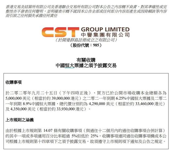 28日(周一)早间,中誉集团在港交所发布的公告称,2020年9月25日(下午四时后),已于公开市场收购本金总额各为500万美元(约3900万港元)的2021年到期6.25%中国恒大票据及2021年到期8.9%中国恒大票据,总代价分别约为429万美元(约3346万港元)及435万美元(约3393万港元)。