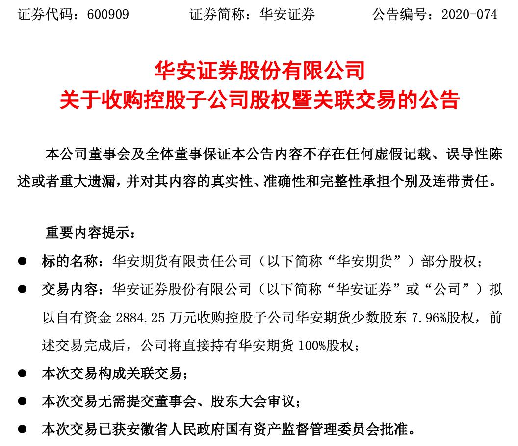 9月29日晚间,华安证券发布公告称,拟以自有资金2884.25万元收购控股子公司华安期货少数股东7.96%股权。预计此次交易完成后,华安证券将直接持有华安期货100%股权。