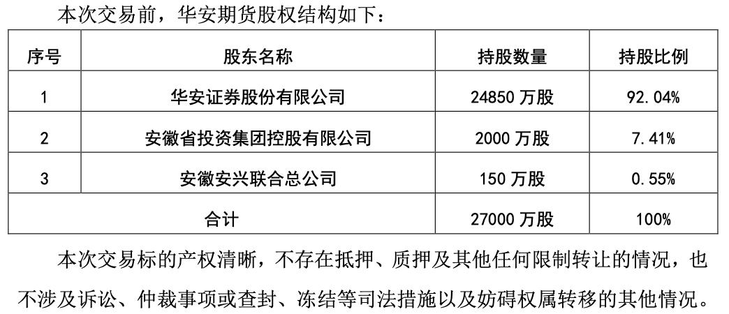 经安徽省人民政府国有资产监督管理委员会批准,华安证券拟分别以自有资金2684.96万元、199.29万元收购华安期货少数股东,安徽省投资集团控股有限公司(简称“安徽省投”)持有的7.41%股权,以及安徽安兴联合总公司(简称“安兴联合”)持有的0.55%股权。