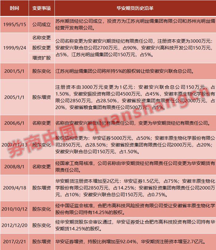 1995年5月,华安期货的前身苏州期货经纪公司成立,4年后经过一系列股权变更、增资扩股,最终更名为安徽安兴期货经纪有限责任公司,这家诞生在江苏的期货公司随之落户安徽。