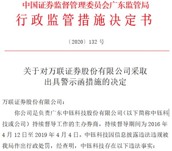 9月28日,广东监管局发布《关于对万联证券采取出具警示函措施的决定》,万联证券是负责中钰科技持续督导工作的主办券商,持续督导期间为2016年4月12日至2019年4月4日,中钰科技因信息披露违法违规在去年4月被监管局作出行政处罚。