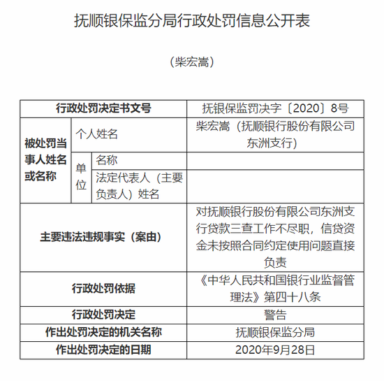 9月30日消息,抚顺银保监分局公布的行政处罚信息公开表显示,抚顺银行股份有限公司东洲支行因贷款三查工作不尽职,信贷资金未按照合同约定使用,被处罚款25万元。同时,相关责任人贾庆信、柴宏嵩对抚顺银行股份有限公司东洲支行贷款三查工作不尽职,信贷资金未按照合同约定使用问题负直接负责,受到警告处分。
