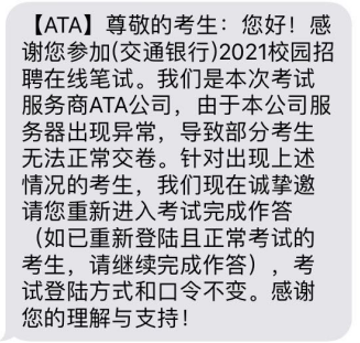 (来源:新浪微博)事发当晚,有考生向媒体反馈称,交行方面回复考生私人邮箱一封《重要通知》,通知显示,“本次考试服务商ATA公司,由于本公司服务器出现异常,导致部分考生无法正常交卷。”同时,《重要通知》显示,“针对出现上述情况的考生,诚挚邀请您重新进入考试完成作答”,并交代称登录方式和口令不变。