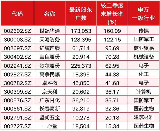 不完全统计显示,两市有约80只个股于9月18日披露的最新股东户数相较于二季度末出现增加,筹码出现分散,其中40只个股增幅超过10%,包括世纪华通、天海防务、高争民爆、卓胜微、长春高新等21只个股的股东户数增幅超过30%,世纪华通股东户数增幅最高达160.09%。