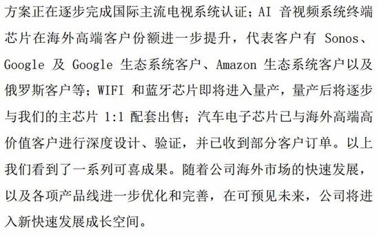 在业务进展方面,公司称目前WIFI和蓝牙芯片即将进入量产,产品推出后将逐步和公司的主芯片1:1配套。随着WIFI和蓝牙芯片的推出和应用,公司整体芯片出货量将会得到较大提升。