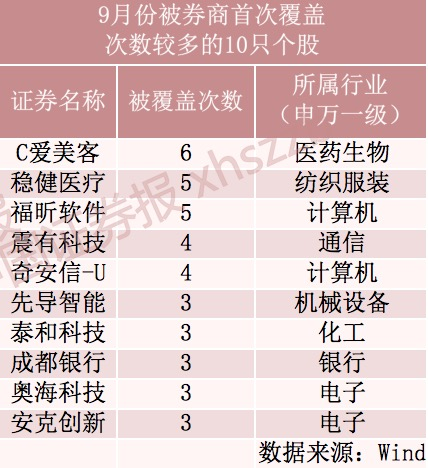 从行业板块看,被券商在9月首次覆盖次数较多的10只个股中,计算机、通信、电子板块的个股共计有5只,这也意味着科技股获得券商扎堆挖掘。