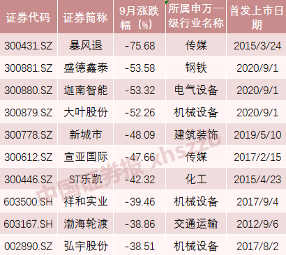 此外,炒作新股并不意味都能赚钱,十大跌幅居前的个股中,也有不少新股。例如9月1日上市的大叶股份,公司上市首日收盘涨幅达到561.53%,盘中一度触及83.60元/股,随后便开始向下调整,最低时仅为29.26元/股,距上市当日的高点下跌65%。