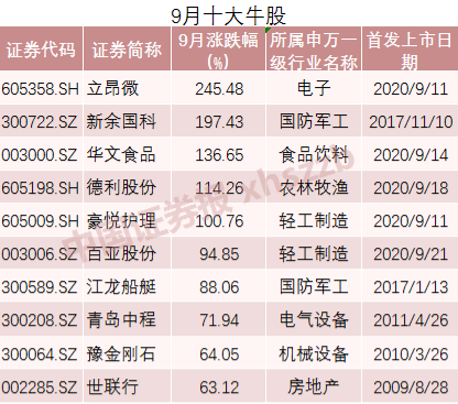具体公司方面,9月涨幅居前的个股仍主要集中在新股,十大涨幅居前的个股中,半壁江山为9月上市的新股。此外,部分妖股如豫金刚石(维权)也位列十大牛股之中。