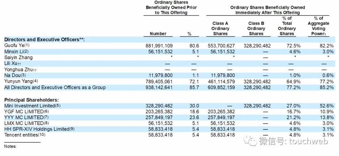 IPO后,叶国富持股为72.5%,有82.2%的投票权;Minxin Li持股为4.6%,有3%的投票权。高瓴资本与腾讯均持股4.8%,有3.1%的投票权。