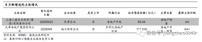 9月新增违约主体2家,为上海三盛宏业投资(集团)有限责任公司和天津房地产集团有限公司。上海三盛宏业投资(集团)有限责任公司为民营企业,控股股东及实际控制人为陈建铭,截至20年9月30日其存续6只债券,余额为60.44亿元,其中未发生违约的债券共5只,余额53.8亿元。天津房地产集团有限公司为地方国有企业,第一大股东为天津津诚国有资本投资运营有限公司,截至20年9月30日其存续9只债券,余额112.318亿元,其中未发生违约的债券共8只,余额92.318亿元。