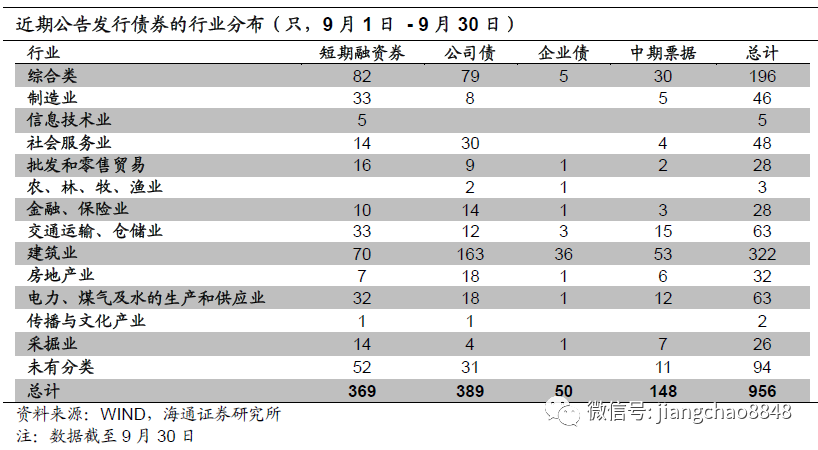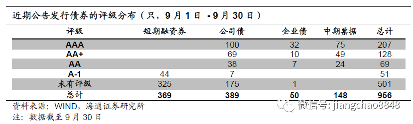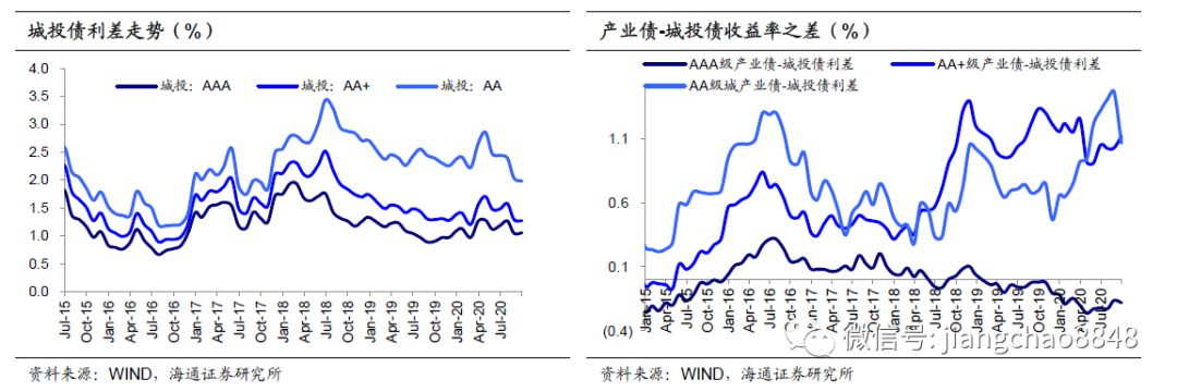 9月城投债利差以走低为主。9月城投债AAA级利差上行1BP,AA+和AA级城投利差分别下行2BP和5BP,以走低为主。