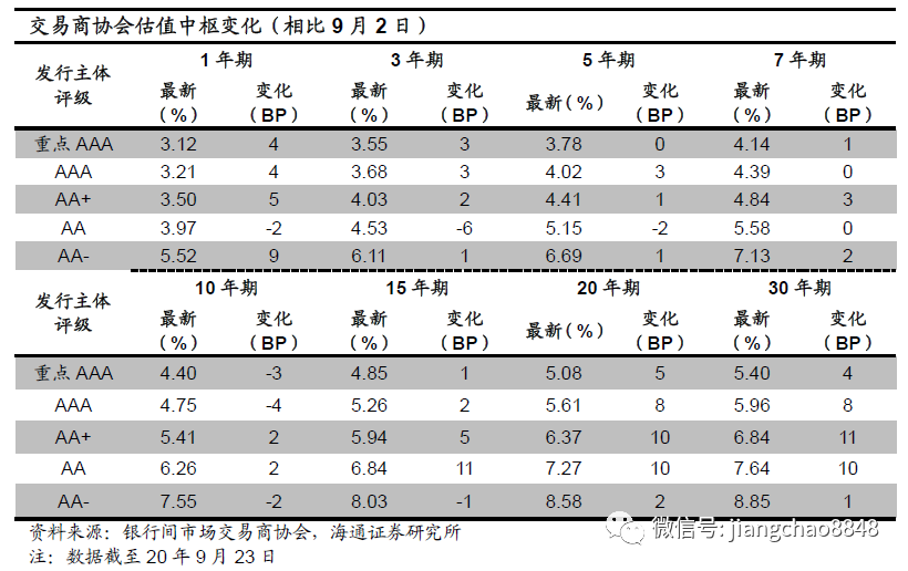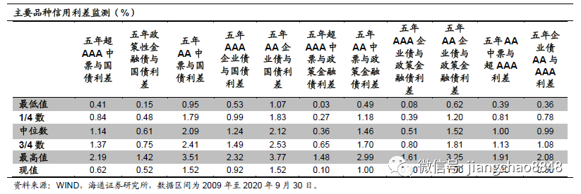 信用债期限利差收窄。具体来看,截至9月30日,5年期和3年期的AA中票期限利差较8月底下行9BP;5年期和3年期的AAA中票期限利差较8月底下行2BP;5年期和1年期AAA中票的期限利差较8月底下行7BP。