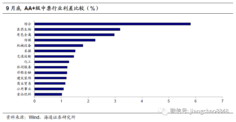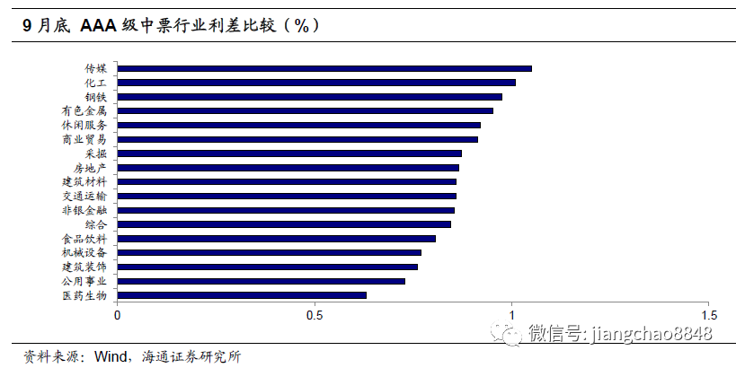 9月行业利差监测与分析。1)信用利差窄幅变动。截止9月30日,3年期AAA等级中票利差为80BP,较8月底上行1BP,5年期AAA等级中票信用利差为92BP,较8月底下行6BP;3年期AA+等级中票信用利差为96BP,较8月底上行3BP,5年期AA+等级中票信用利差为115BP,较8月底下行8BP;3年期AA等级中票信用利差为112BP,较8月底上行5BP,5年期AA等级中票信用利差为152BP,较8月底下行9BP。信用债等级利差不再压缩,前期短久期下沉资质节奏放缓。2)产业债与城投债利差分化。9月城投债利差以走低为主。9月城投债AAA级利差上行1BP,AA+和AA级城投利差分别下行2BP和5BP。产业债与城投债利差分化,AA级信用债中城投表现显著好于产业债。具体来看,AAA级产业债-城投债利差目前在-18BP,较8月底下行2BP;AA+级产业债-城投债利差目前在112BP左右,较8月底上行9BP;而AA级产业债-城投债利差目前在107BP左右,较8月底下行40BP。3)行业横向比较:高等级债中,传媒、化工是利差最高的两个行业,医药生物是平均利差最低的行业,目前为63BP。中等级债券中,综合类行业利差最高,其次为医药生物和有色金属行业,AA+等级综合类及医药生物行业利差均在300BP以上。食品饮料行业利差水平相对最低,为102BP。