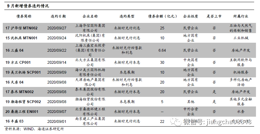 9月新增违约债券10只,分别为17沪华信MTN002、15沈机床MTN001、16三盛04、19方正CP001、19美兰机场SCP001、16天房04、17泰禾MTN002、19渤海租赁SCP002、20桑德工程EN001和16丰盛03。新增违约债券涉及企业共10家。就企业性质来看,民营企业、国有企业、中外合资企业、其他分别有4家、4家、1家、1家;就是否为上市公司来看,上市共2家;从行业分布来看,房地产行业3家,占比最多。