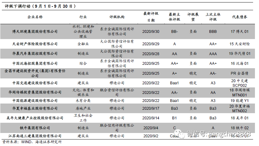 9月评级调整及债券违约情况回顾。9月公告5项信用债主体评级向上调整行动,全部为评级实质上调;公告12项主体评级向下调整行动,其中10项主体评级为实质下调。与前一月相比,向上调整和向下调整的评级数目均减少。评级上调主体中有2家城投平台,下调的主体中有1家城投平台。评级下调的债券发行主体共有12个,涉及行业包括建筑业、房地产业和制造业等多个行业。9月新增违约债券10只,新增违约债券涉及企业共10家,其中新增违约主体2家。民营企业、国有企业、中外合资企业、其他分别有4家、4家、1家、1家。