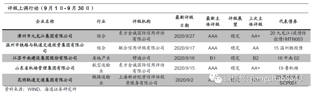 评级上调的发行人漳州市九龙江集团有限公司非城投平台,来自综合类行业,信用评级上月从AA+上调至AAA。主要原因是公司片仔癀系列药品仍具有独家生产权,药品市场地位高,公司 2020 年 7 月收购龙晖药业 51%股权,产品线进一步丰富,综合竞争力很强;且未来随着公司投资项目—福海创石化技改完成,预计该投资项目为公司贡献的投资收益将进一步增长。