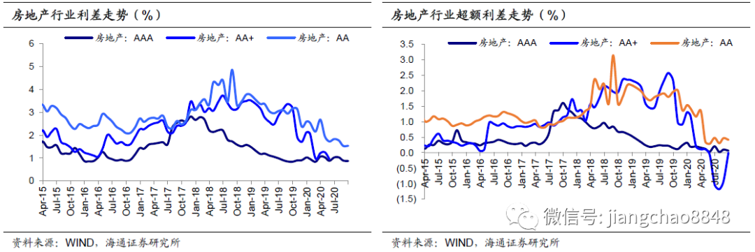 地产行业低等级和高等级债超额利差收窄。具体来看,截至9月30日AAA级地产行业超额信用利差为7BP,较8月底下行3BP,AA级地产行业超额信用利差为41BP,较8月底下行6BP。