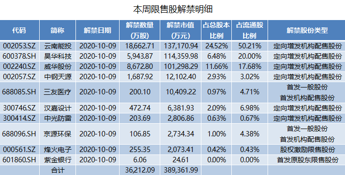 本周仅有一个交易日,Wind数据显示,10月9日解禁公司10家,解禁数量3.62亿股,约合市值38.94亿元,压力较小。其中,云南能投(002053.SZ)、昊华科技(600378.SH)、威华股份(002240.SZ)三家公司解禁市值超过10亿元,均为定向增发机构配售股份解禁。
