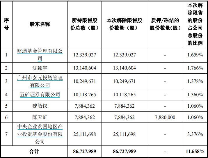 值得注意的是,这三家公司解禁相关股东收益均超过50%。云南能投为限售5年股份解禁,涉及股东仅公司控股股东一家云南省能源投资集团有限公司,解禁数量1.87亿股,占比24.52%。威华股份则是限售期1年的定增股东解禁,共7位包括3位自然人和4家机构股东。