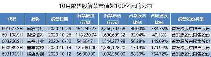 10月解禁数量超过5亿股的公司有5家,分别为渝农商行(601077.SH)、广宇发展(000537.SZ)、宝丰能源(600989.SH)、彩虹股份(600707.SH)、财通证券(601108.SH)。