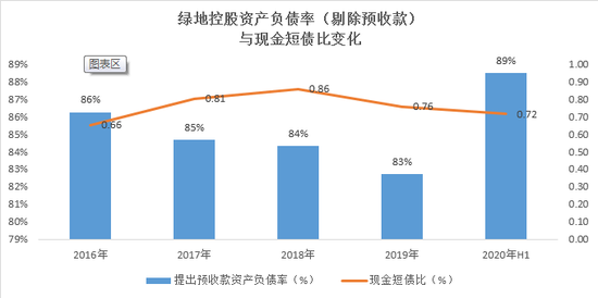 除此之外,绿地控股剔除预收款后的资产负债率也攀升至89%,创近五年新高,公司上半年现金短债比为0.72,此两项指标也超过或接近三道红线要求。