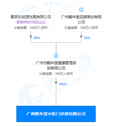 值得注意的是,股权关系图显示,霍英东铭源发展有限公司和广州鹤年堂品牌策划有限公司分别持广州市鹤年堂健康管理咨询有限公司50%的股权。