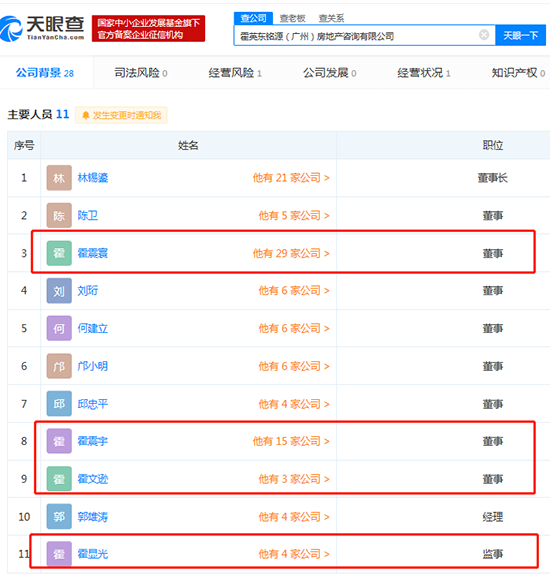 记者注意到,天眼查显示,在霍英东铭源(广州)房地产咨询有限公司的主要人员中,林锡鎏担任董事长,霍震寰、霍震宇、霍文逊3人均担任董事,霍显光担任监事。