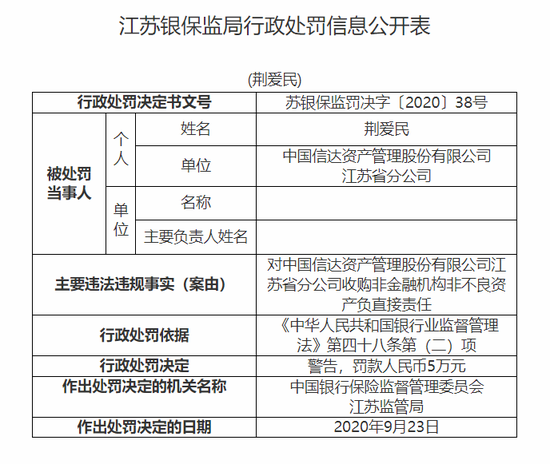 10月9日消息,江苏银保监局公布的行政处罚信息公开表显示,中国信达资产管理股份有限公司江苏省分公司因收购非金融机构非不良资产,被处罚款50万元。同时,相关责任人荆爱民对中国信达资产管理股份有限公司江苏省分公司收购非金融机构非不良资产负直接责任,受到警告处分并被罚款5万元。