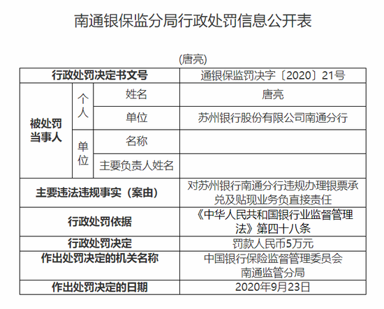 10月9日消息,南通银保监分局公布的行政处罚信息公开表显示,苏州银行股份有限公司南通分行因违规办理银票承兑及贴现业务,被处罚款30万元。相关责任人唐亮对苏州银行南通分行违规办理银票承兑及贴现业务负直接责任,被处罚款5万元。